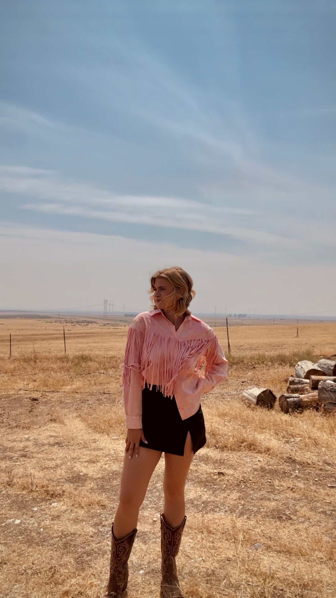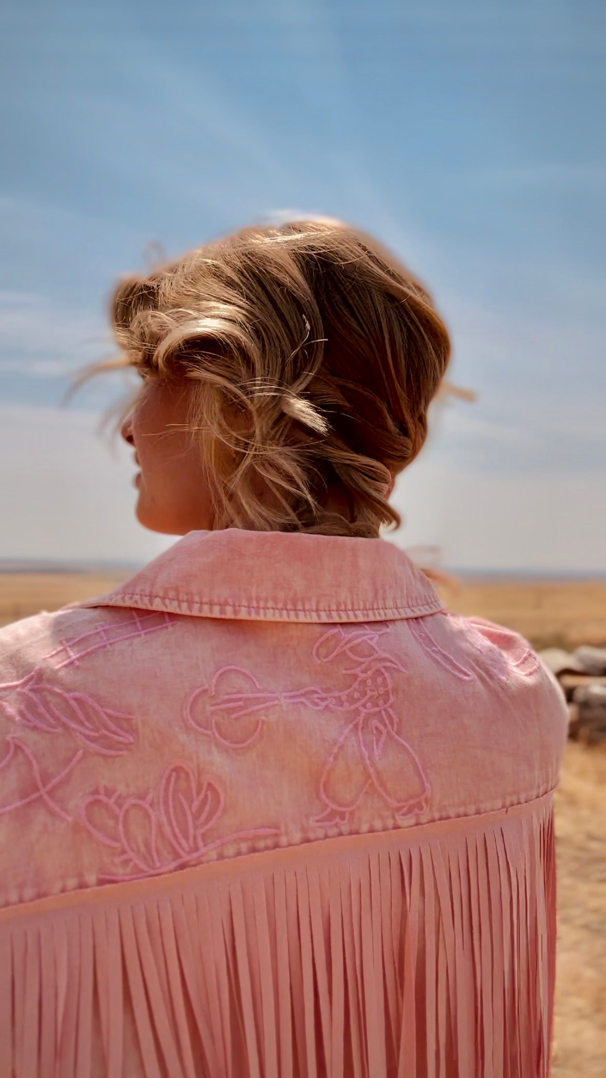 We love our pink acid wash top, complete with vintage style embroidery, and fringe!